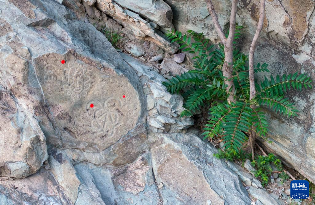 這是7月23日在賀蘭山巖畫景區拍攝的巖畫和紅色標識點(無人機照片)。標識點方便游客找到巖畫,可以隨時粘貼,對石質和文物不會產生影響。