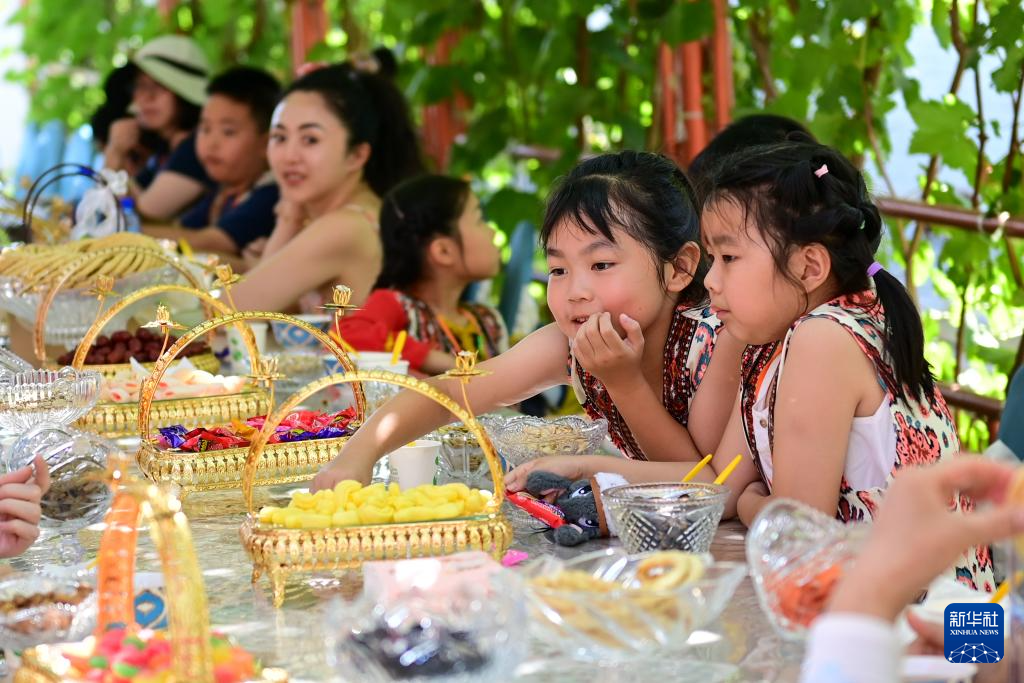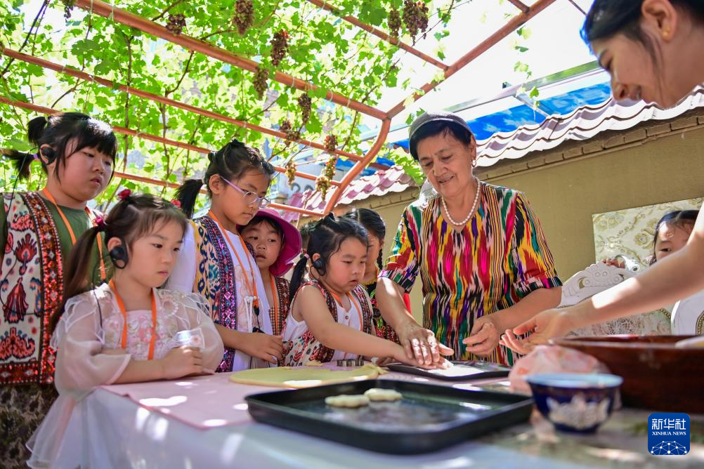 研學游的小朋友在新疆伊犁哈薩克自治州伊寧市伊犁老城喀贊其文化旅游區學做當地特色糕點(7月23日攝)。
