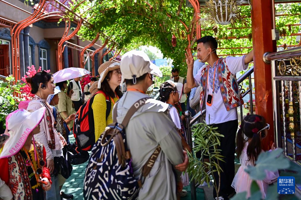 游客在新疆伊犁哈薩克自治州伊寧市伊犁老城喀贊其文化旅游區家訪點參觀(7月23日攝)。