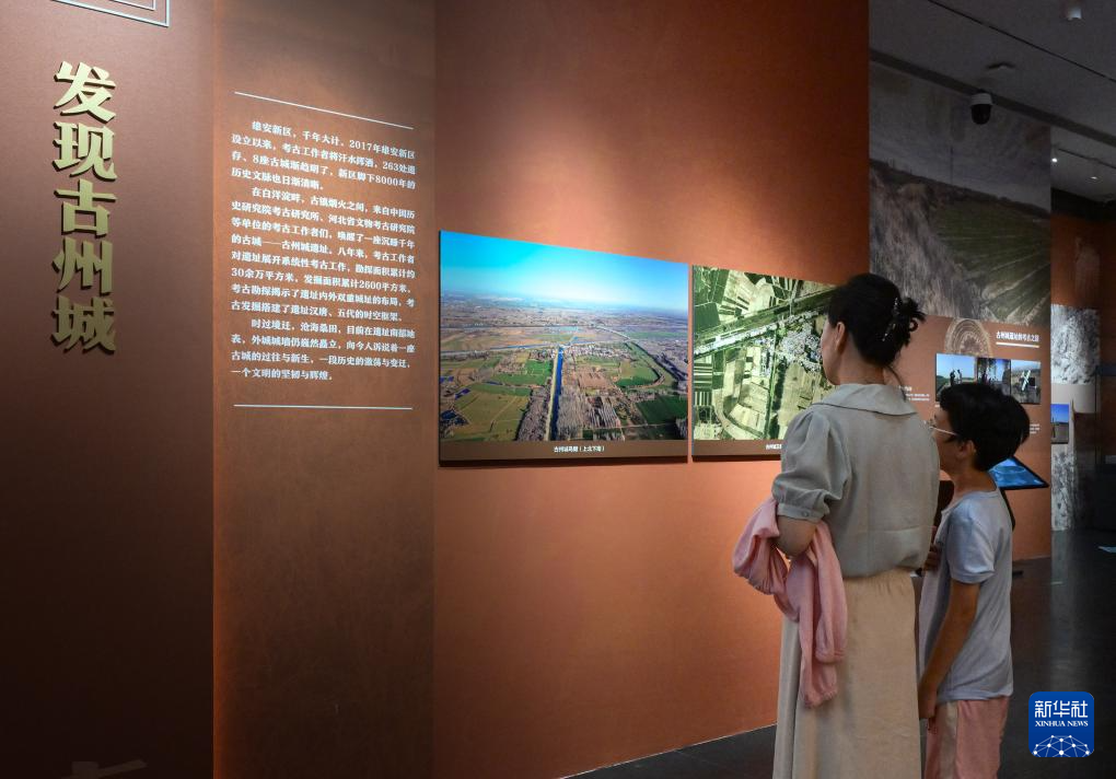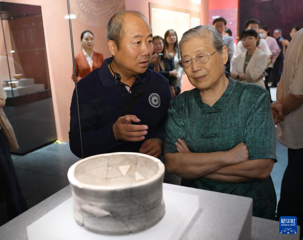 7月28日,著名考古學家、中國社會科學院考古研究所研究員安家瑤(右)在雄安新區聯合考古隊領隊何歲利的陪同下參觀展覽。