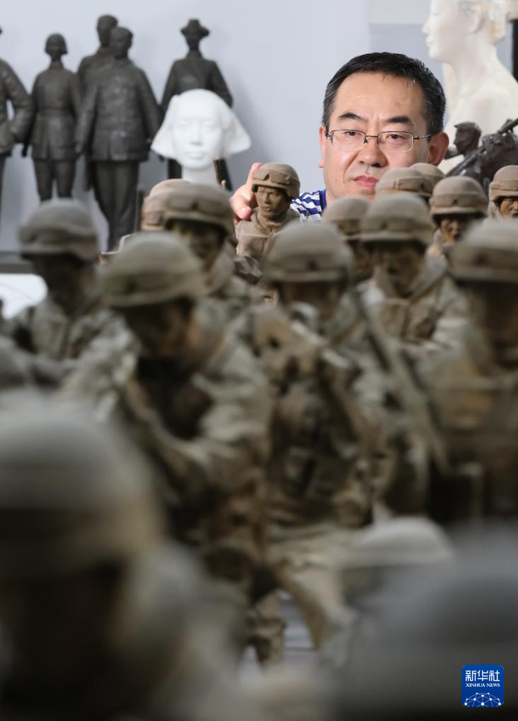 7月24日,國防大學軍事文化學院副教授王樹山在查看自己的雕塑作品。