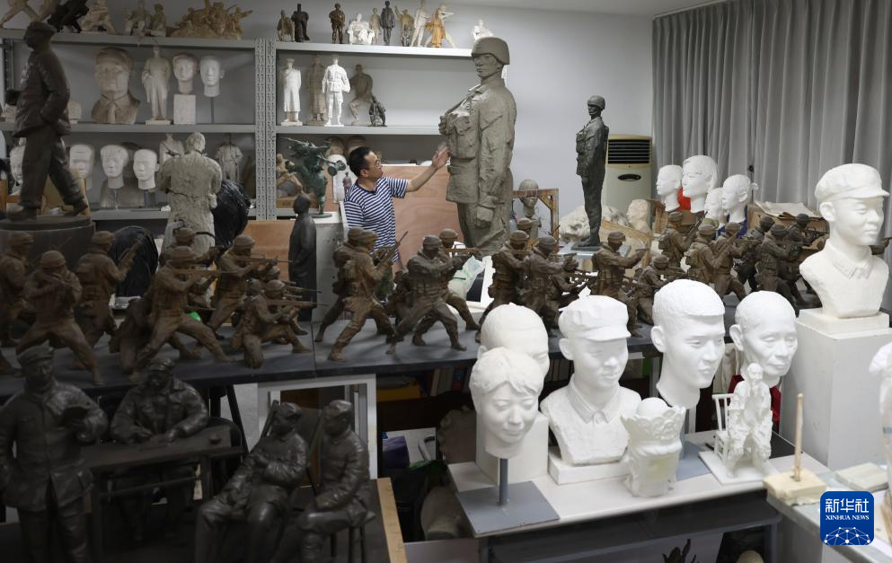 7月17日,解放軍文工團雕塑創作員郎鉞在進行雕塑創作。