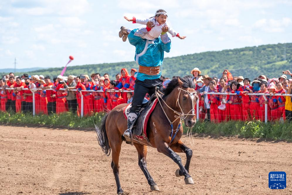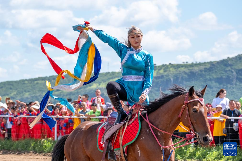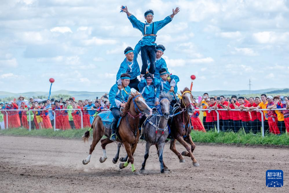 8月7日,演員在農牧民那達慕大會上表演馬術。