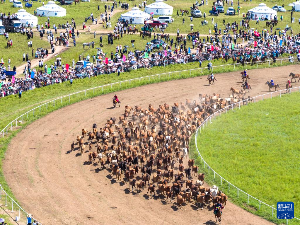 8月7日,游客在農牧民那達慕大會上觀看跑馬表演(無人機照片)。