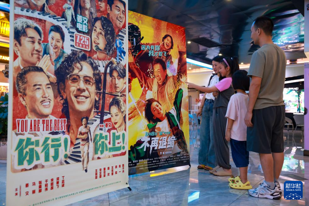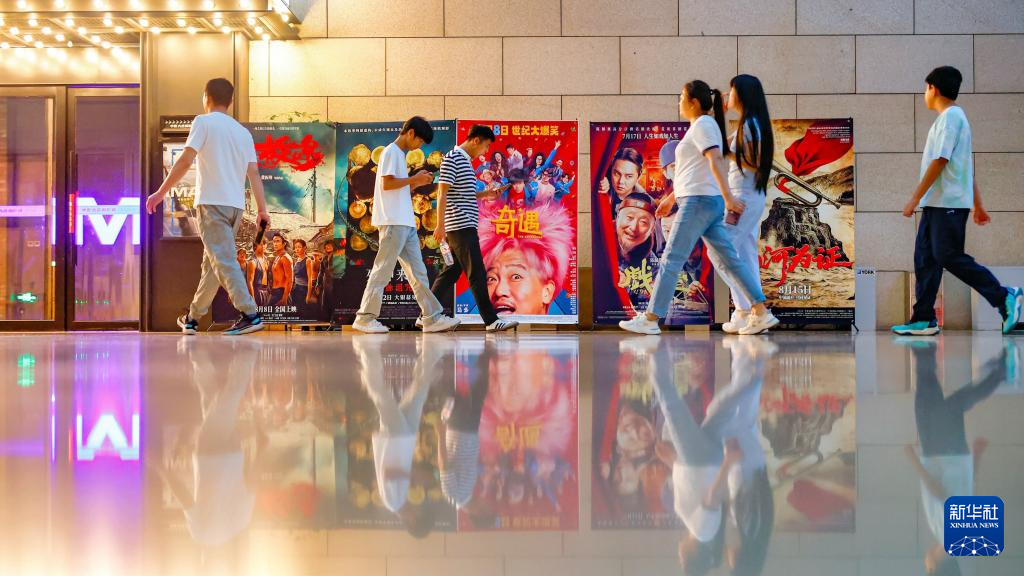8月10日,人們從天津市濱海新區一家影城的暑期檔電影宣傳海報前走過。