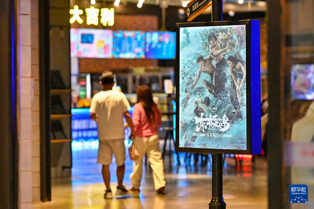 8月10日晚,觀眾在云南省紅河哈尼族彝族自治州開遠市的一家電影院內觀看暑期檔電影宣傳海報。
