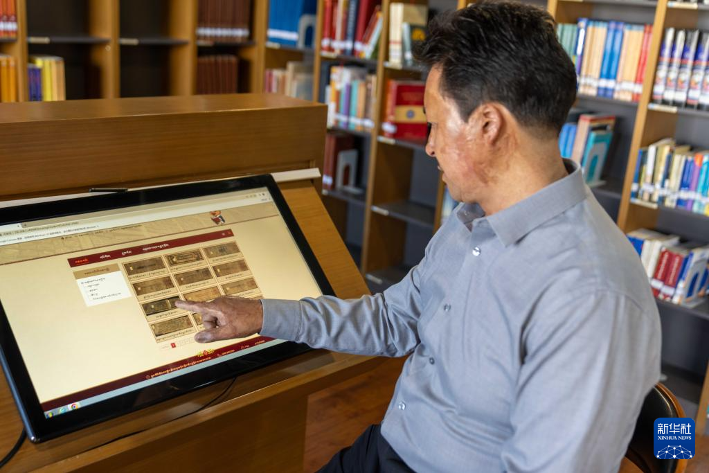8月13日,西藏自治區圖書館副館長邊巴次仁在介紹數據庫中的藏文古籍。