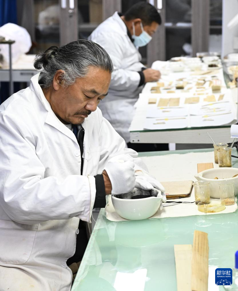 5月25日,布達拉宮貝葉經實驗性修復小組實驗室工作人員在對用于貝葉修復的顏料進行研磨處理。