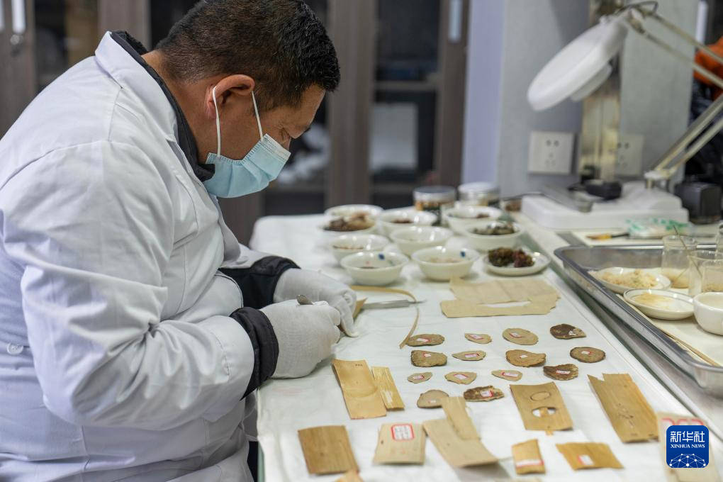 5月25日,布達拉宮貝葉經實驗性修復小組實驗室工作人員在對貝葉進行處理。