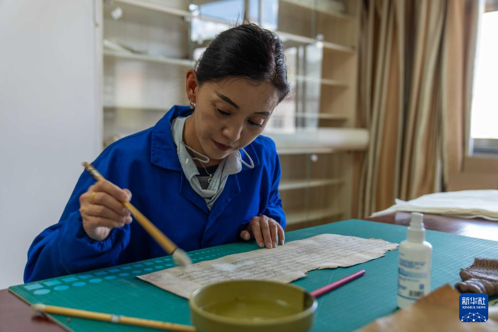 8月13日,西藏自治區古籍保護中心古籍修復員次仁央宗在對古籍進行除霉。