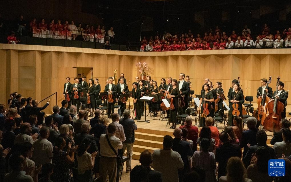 8月13日,在德國法蘭克??藗愗惛褚魳穼W院卡薩爾斯音樂廳,中德音樂家向觀眾謝幕。
