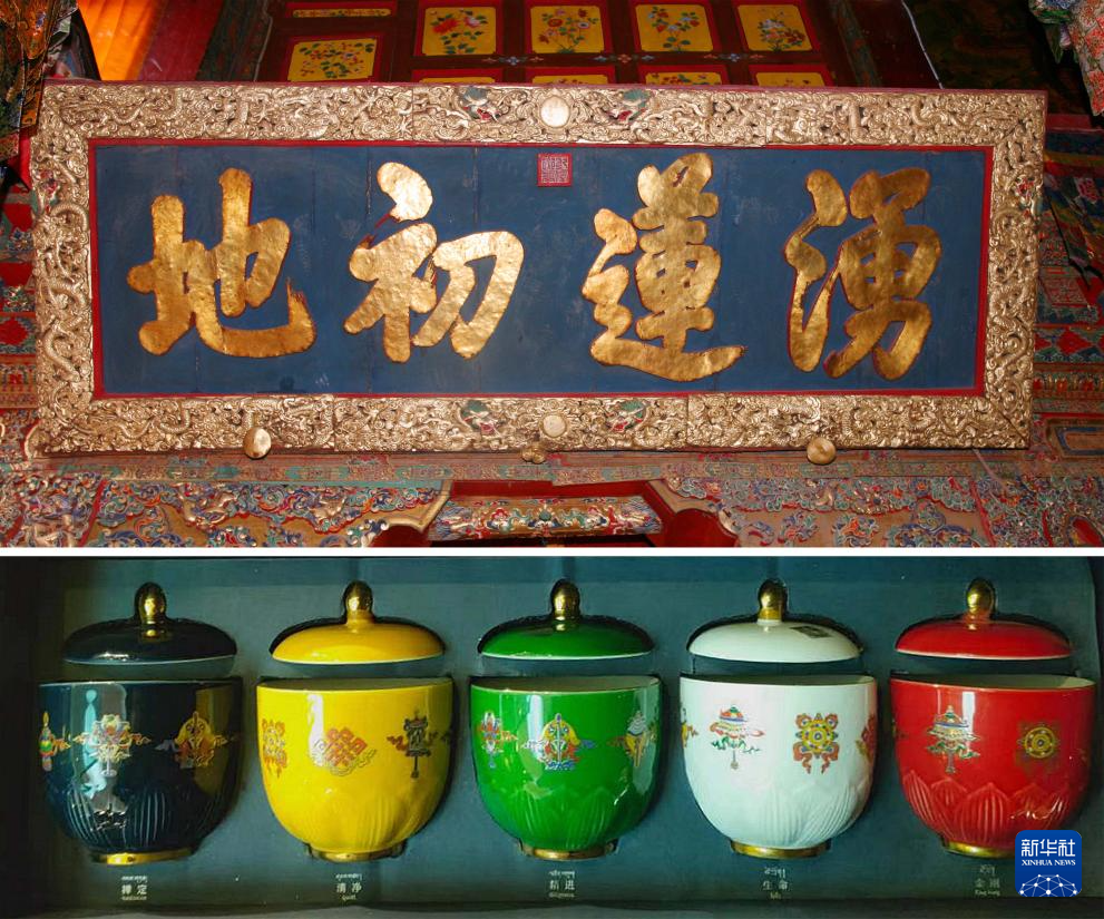 拼版照片:上圖為懸掛于布達拉宮西大殿正中上方、乾隆賜予八世達賴喇嘛的御筆金字匾額“涌蓮初地”;下圖為布達拉宮紅山腳下文創體驗店內的“蓮花五蘊杯”文創瓷器(2021年1月26日攝)。新華社記者 孫非 攝