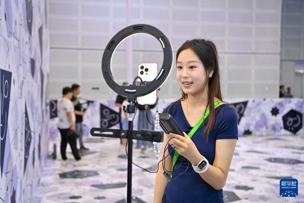8月21日,工作人員在第七屆山西文化產業博覽交易會上直播。