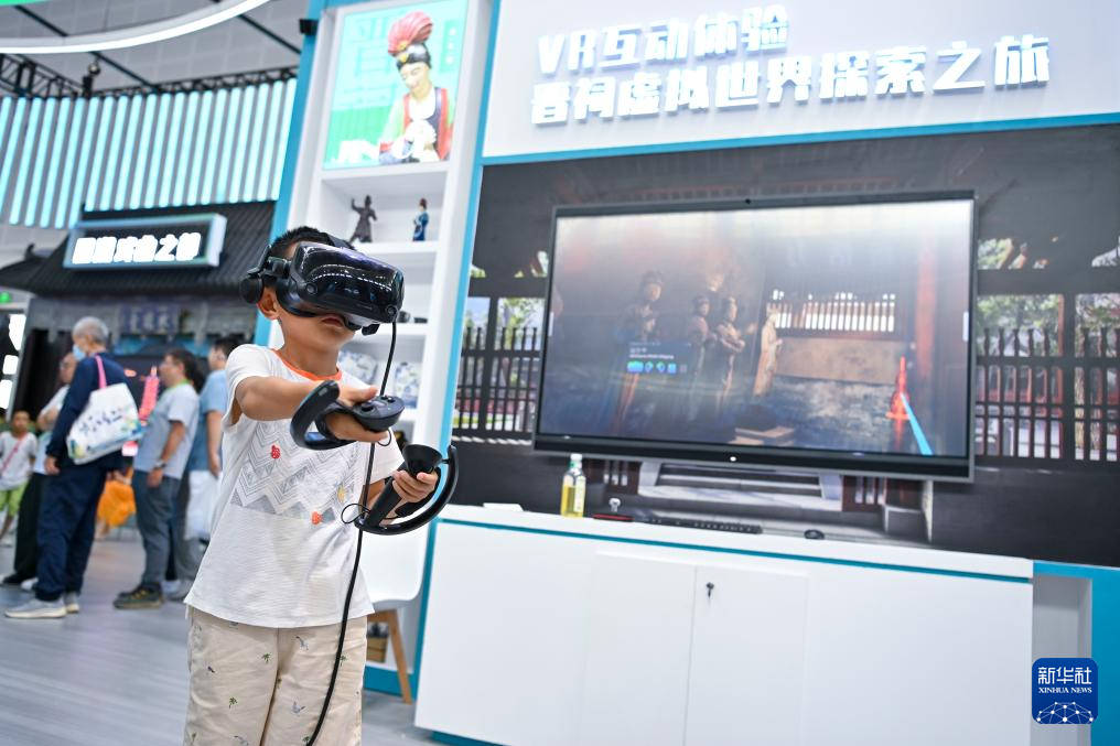 8月21日,一位小朋友在第七屆山西文化產業博覽交易會上通過VR設備游覽晉祠。