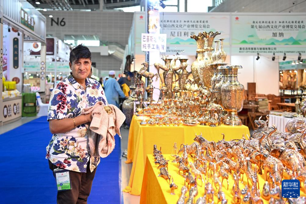8月21日,一位參展商在第七屆山西文化產業博覽交易會上留影。