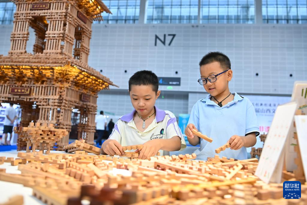 8月21日,兩位小朋友在第七屆山西文化產業博覽交易會上體驗榫卯積木拼搭。