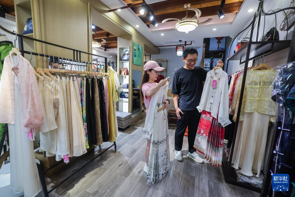 8月26日,游客在嘉興市南湖區月河歷史街區的一家店里挑選傳統服飾。