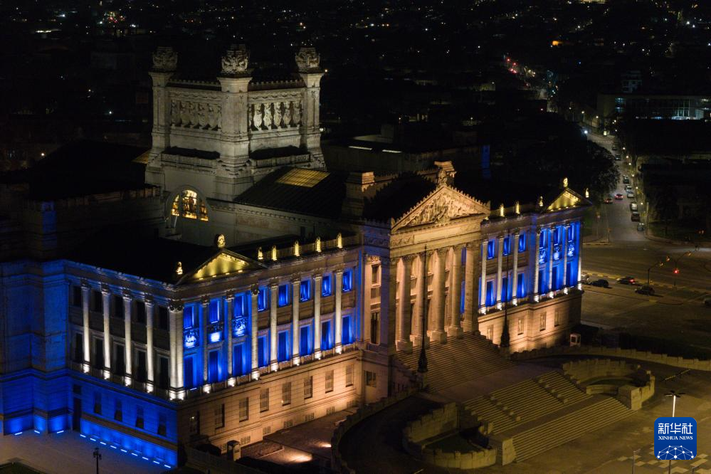 8月25日,烏拉圭在位于首都蒙得維的亞的立法宮舉行音樂會,紀念宣告獨立200周年。音樂會后,立法宮亮起彩燈(無人機照片)。