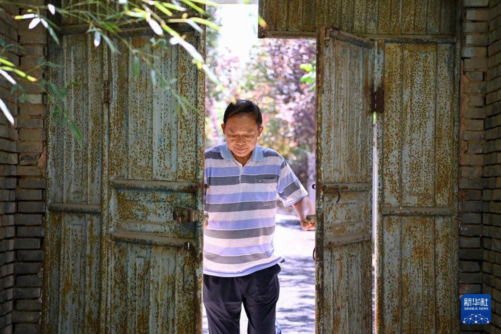 杜德建推開位于山西省永濟市卿頭鎮張坊村的張坊學校大門(9月9日攝)。由于家中圖書越來越多,2015年,杜德建租下村里學校閑置的幾間房屋用于存放圖書、報刊。