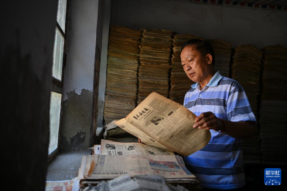 杜德建在位于山西省永濟市卿頭鎮張坊村張坊學校內的圖書室內查看一份舊報紙(9月9日攝)。由于家中圖書越來越多,2015年,杜德建租下村里學校閑置的幾間房屋用于存放圖書、報刊。