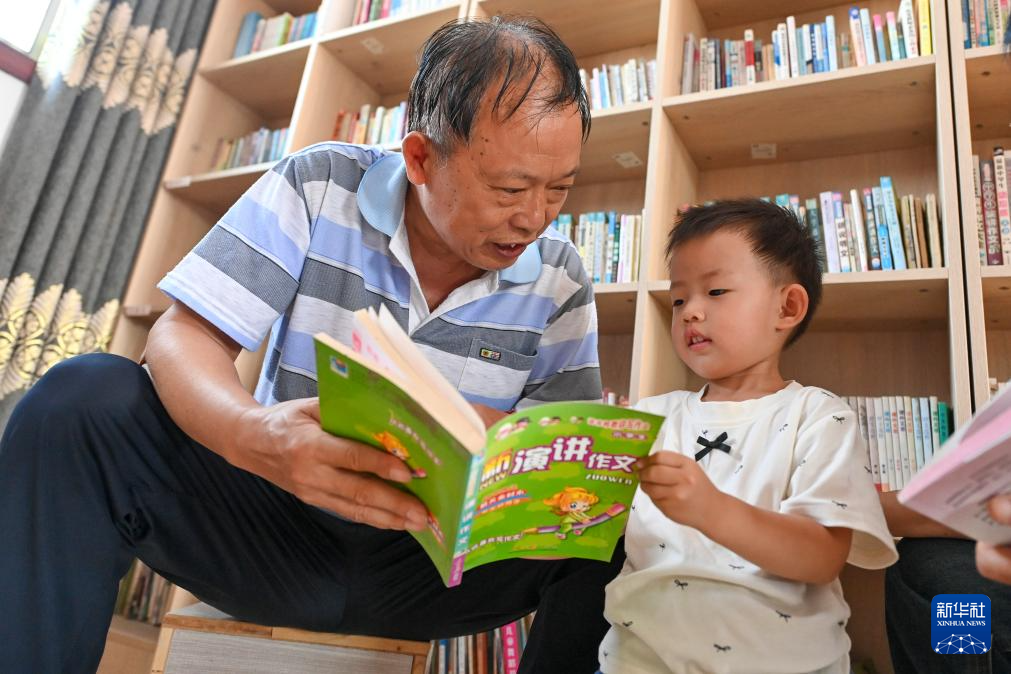 在位于山西省永濟市卿頭鎮張坊村的家庭圖書館內,杜德建(左)和一位小朋友交流(9月9日攝)。