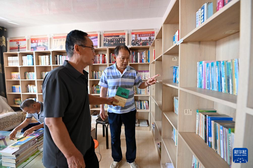 在位于山西省永濟市卿頭鎮張坊村的家庭圖書館內,杜德建(右)為村民挑選圖書(9月9日攝)。
