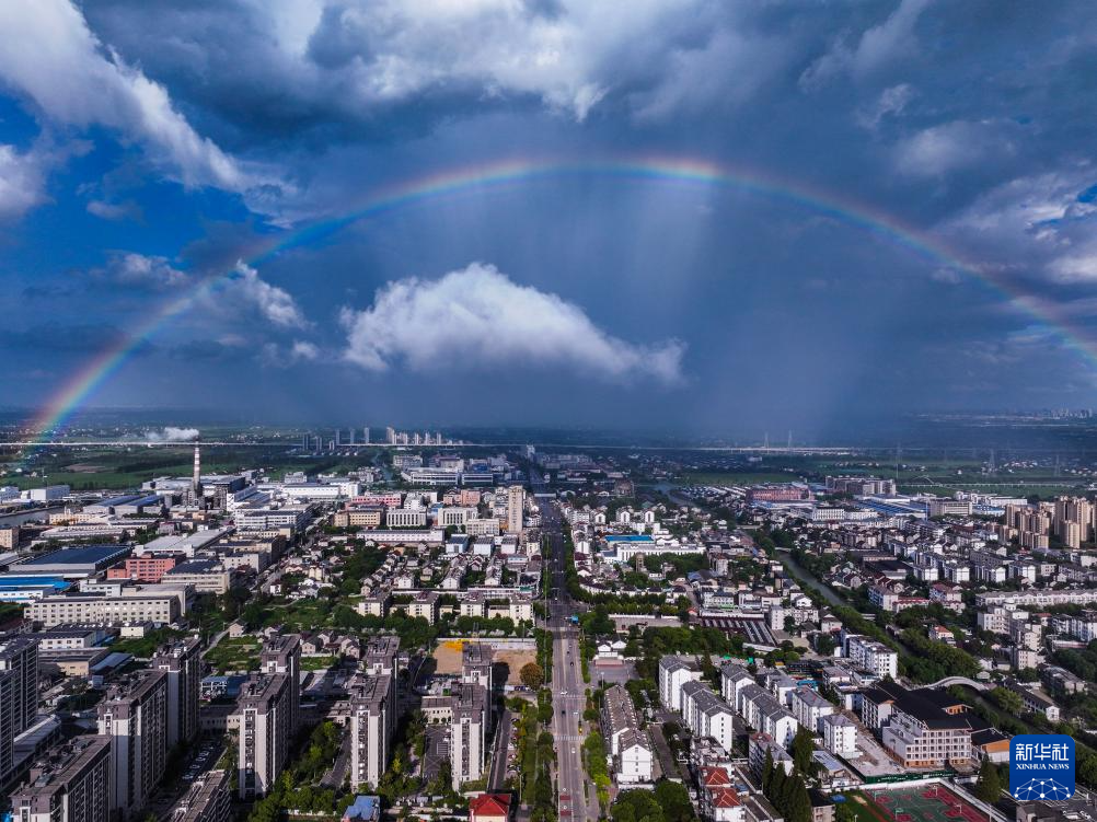 這是9月19日在沈蕩鎮拍攝的雨后彩虹(無人機照片)。