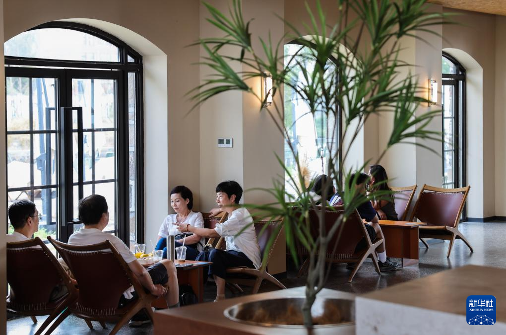 9月19日,游客在沈蕩鎮谷倉文化產業園的咖啡館內休憩。谷倉文化產業園由之前的國營糧倉改建而成,也是當地的網紅打卡點之一。