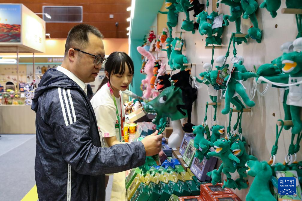 9月21日,與會嘉賓在第八屆絲綢之路(敦煌)國際文化博覽會上選購非遺文創產品。