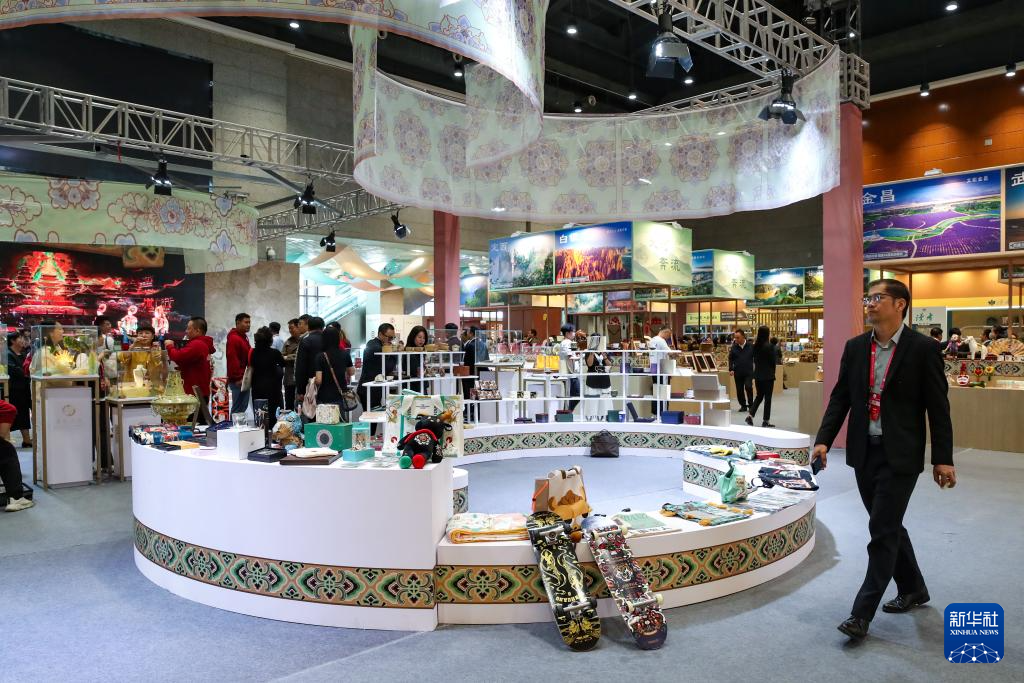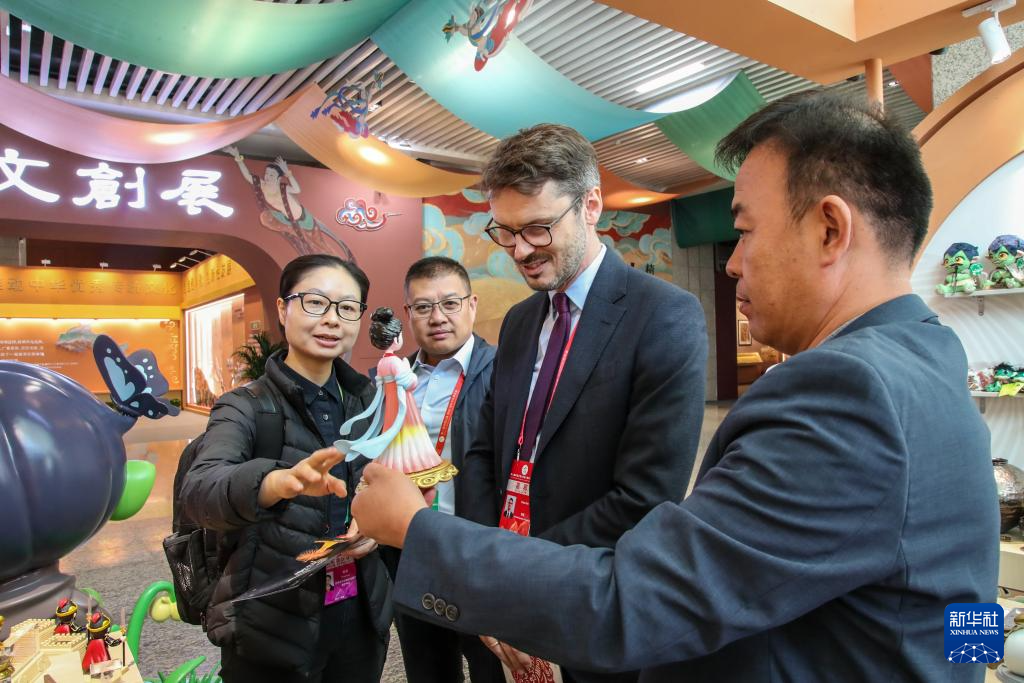9月21日,與會嘉賓在第八屆絲綢之路(敦煌)國際文化博覽會上參觀甘肅文旅非遺文創展。