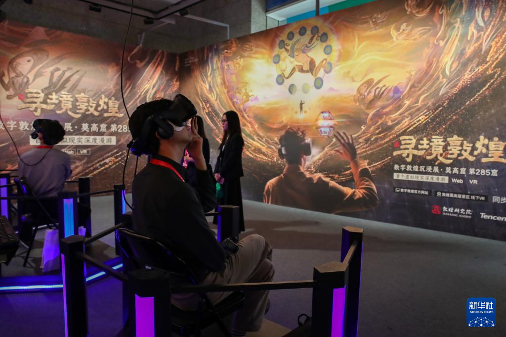 9月21日,在第八屆絲綢之路(敦煌)國際文化博覽會上,與會嘉賓借助VR設備沉浸式游覽莫高窟虛擬場景。
