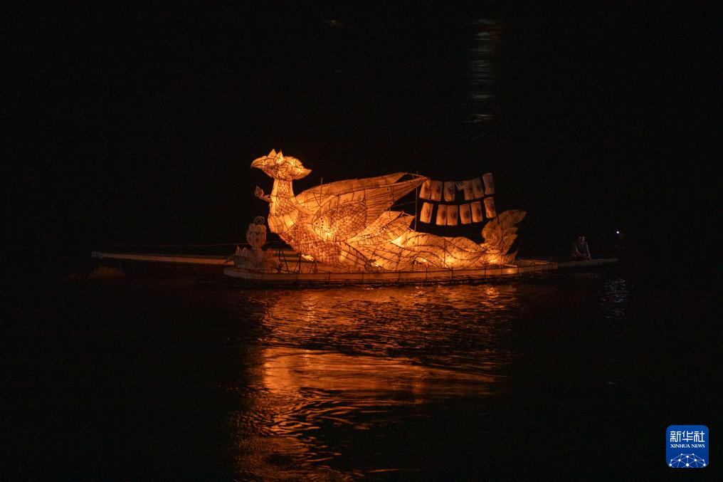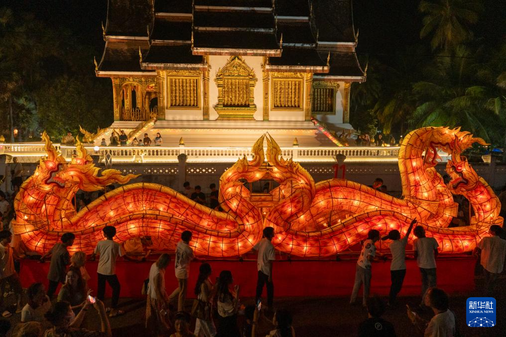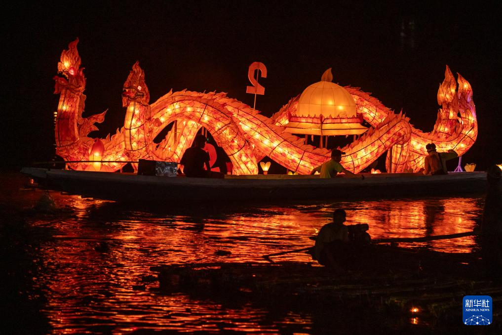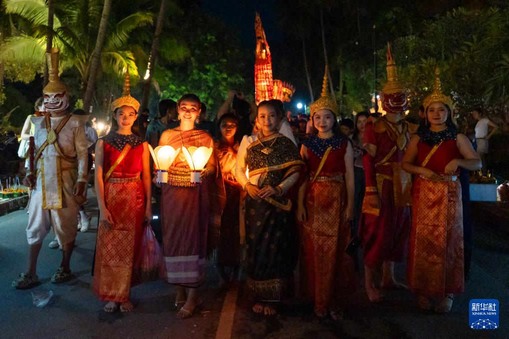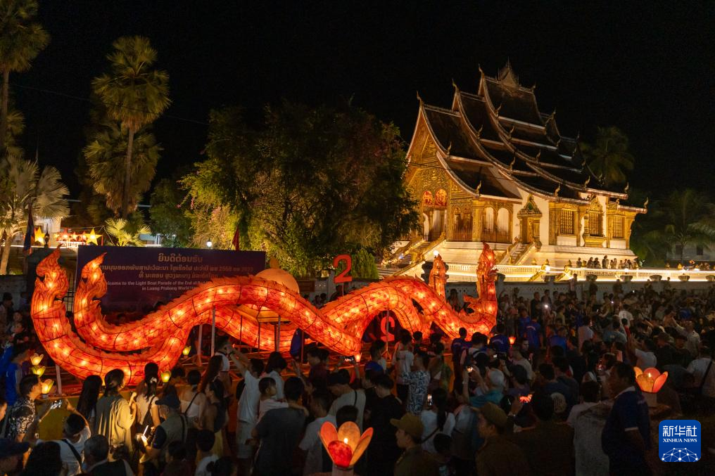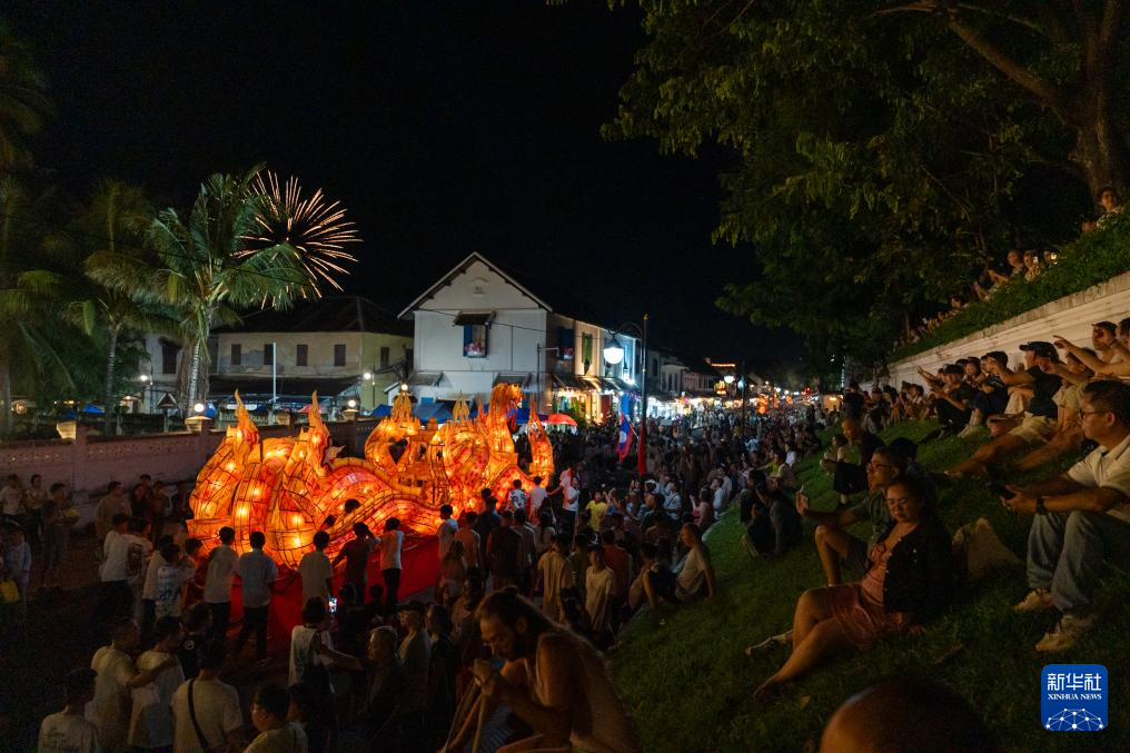 10月8日,老撾瑯勃拉邦慶祝傳統節日——燈船節。當晚,老撾瑯勃拉邦的街頭燈光閃爍,人們穿著傳統服裝參加燈船游行,將燈船放入湄公河中,祈求來年風調雨順、幸福安康。