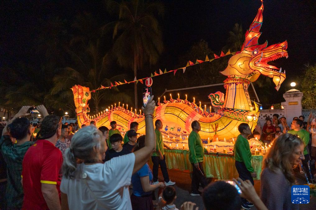 10月8日晚,燈船入水前在老撾瑯勃拉邦主要街道游行,老撾民眾和外國游客紛紛前來觀看。