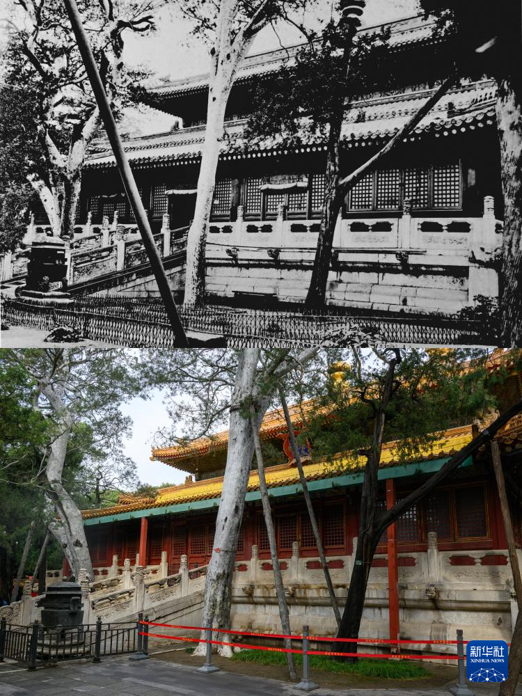 拼版照片:上圖為20世紀20年代拍攝的儲秀宮(故宮博物院供圖);下圖為2025年10月10日拍攝的儲秀宮(新華社記者金良快攝)。