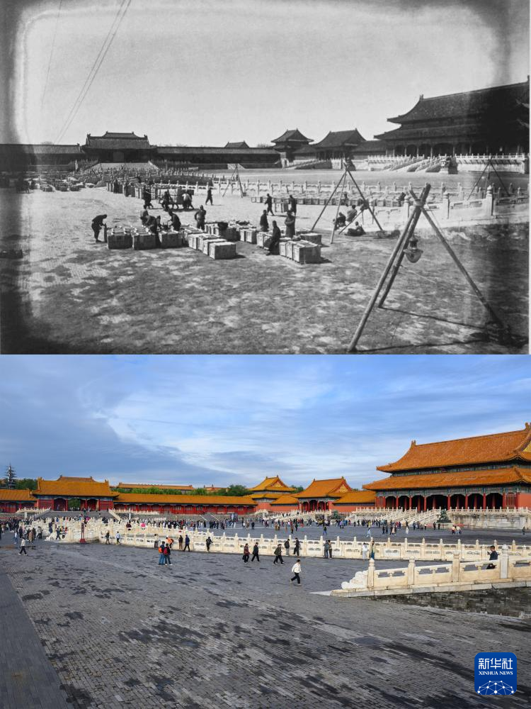 拼版照片:上圖為1933年2月拍攝的太和門廣場第一批文物南遷時的情景(故宮博物院供圖);下圖為2025年10月10日拍攝的太和門廣場(新華社記者金良快攝)。