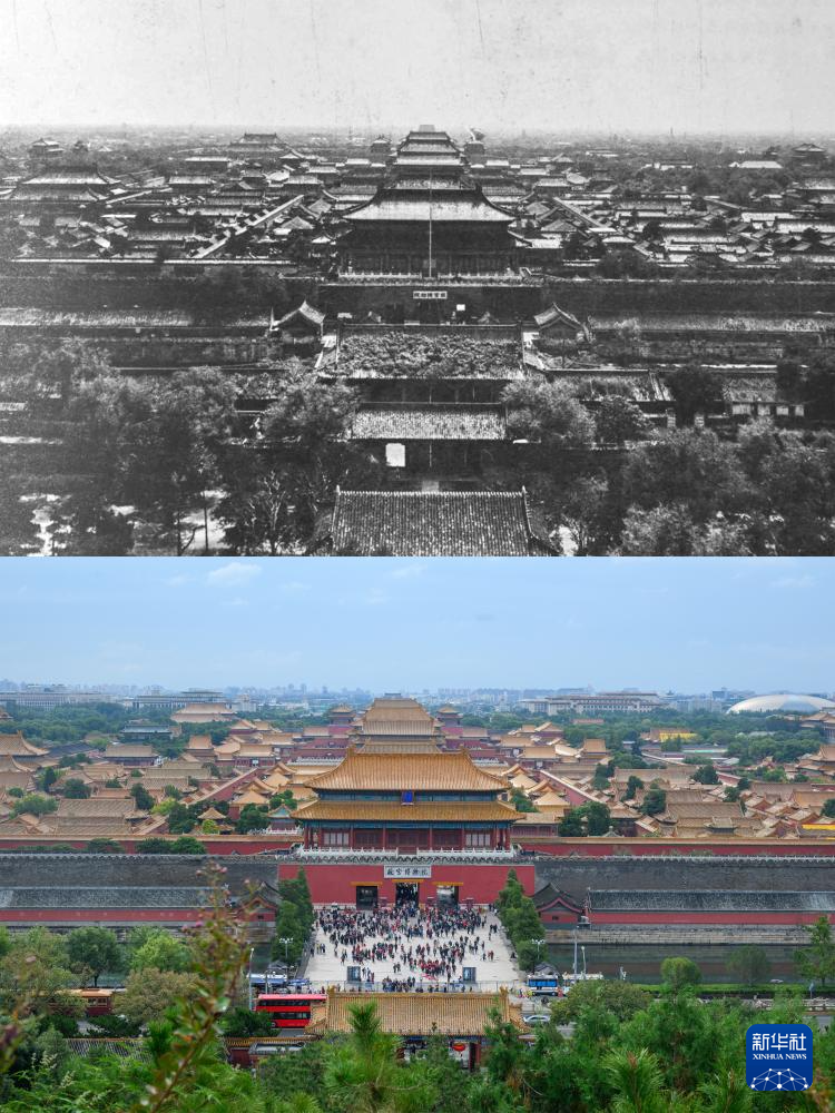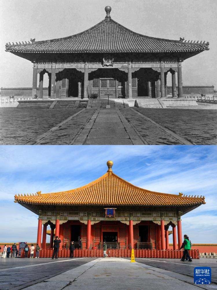 拼版照片:上圖為20世紀初拍攝的中和殿(故宮博物院供圖);下圖為2025年10月10日拍攝的中和殿(新華社記者金良快攝)。