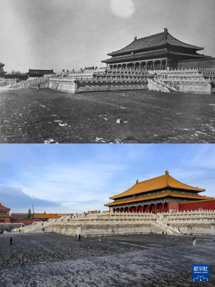 拼版照片:上圖為20世紀初拍攝的太和殿(故宮博物院供圖);下圖為2025年10月10日拍攝的太和殿(新華社記者金良快攝)。