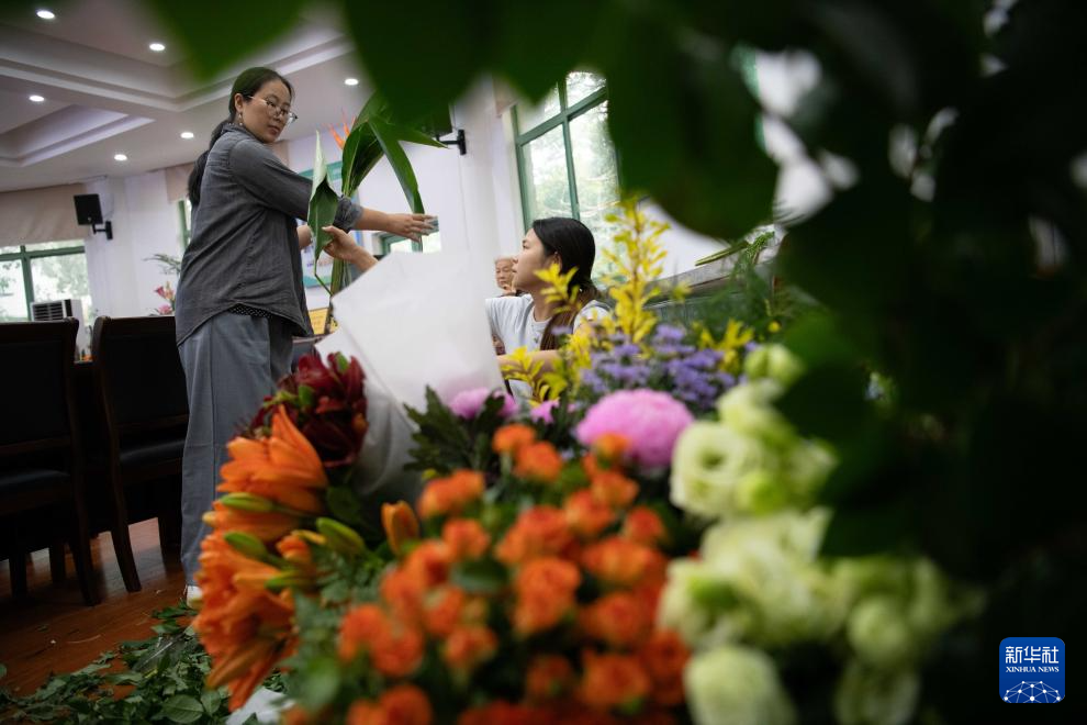 10月10日,在位于安徽合肥的一家花店,付玉蘭挑選用于插花創作的花材。