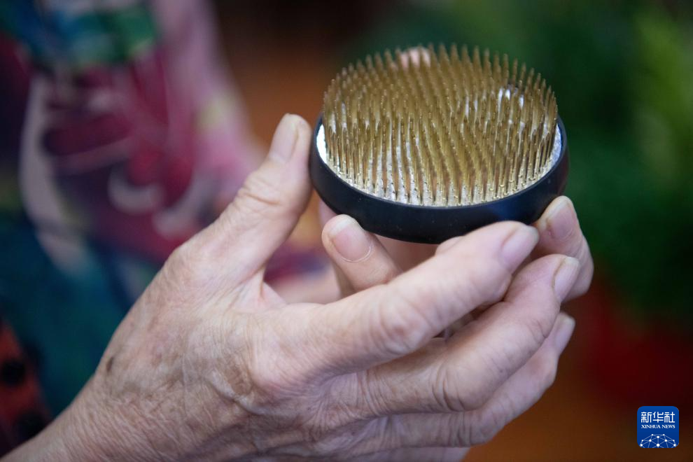 9月29日,在安徽農業大學林學與園林學院徽派插花藝術傳承基地,付玉蘭展示插花固定用具“劍山”。