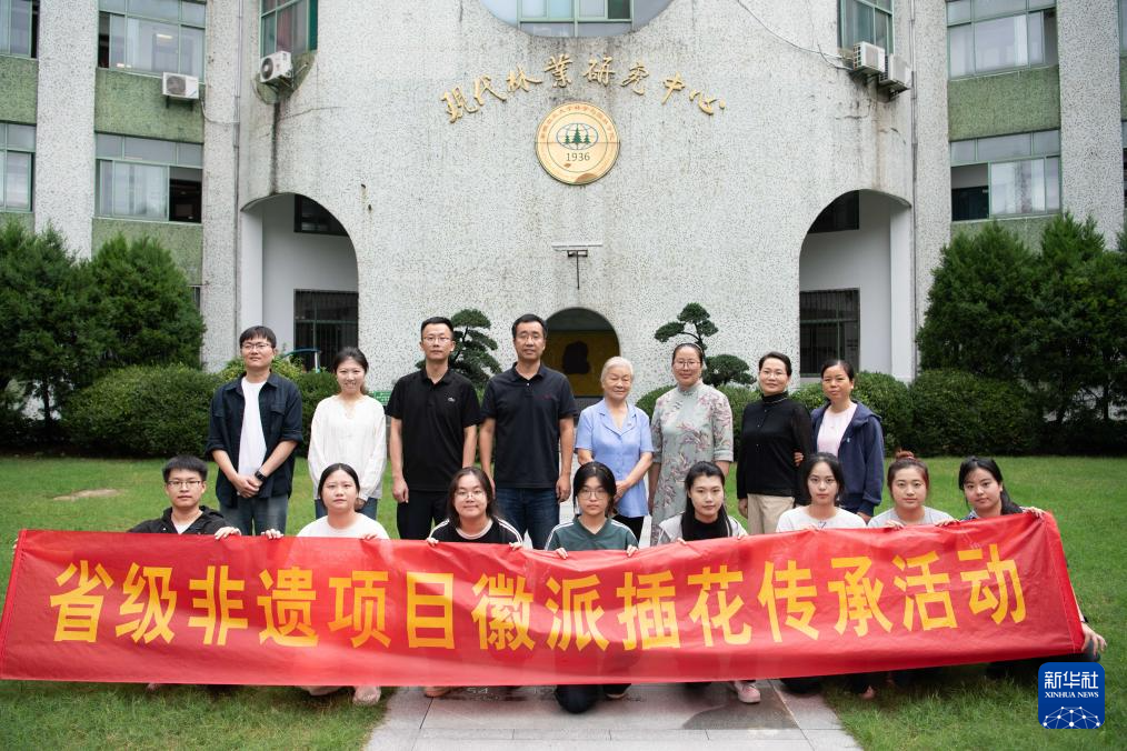 9月30日,在安徽農業大學林學與園林學院,徽派插花藝術傳承團隊核心成員付玉蘭(后排右四)與團隊成員及在校師生合影留念。