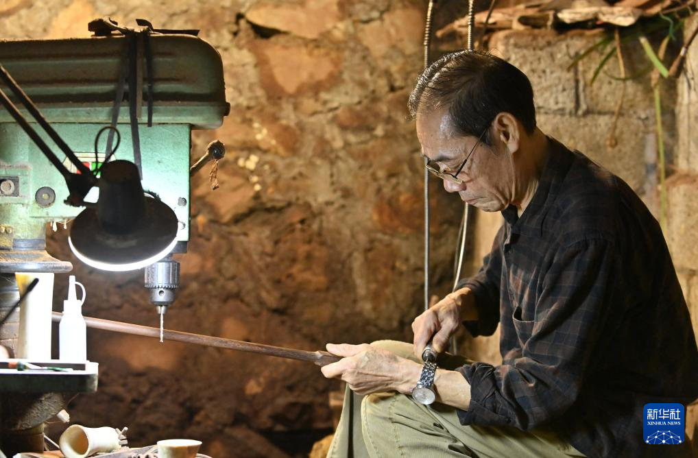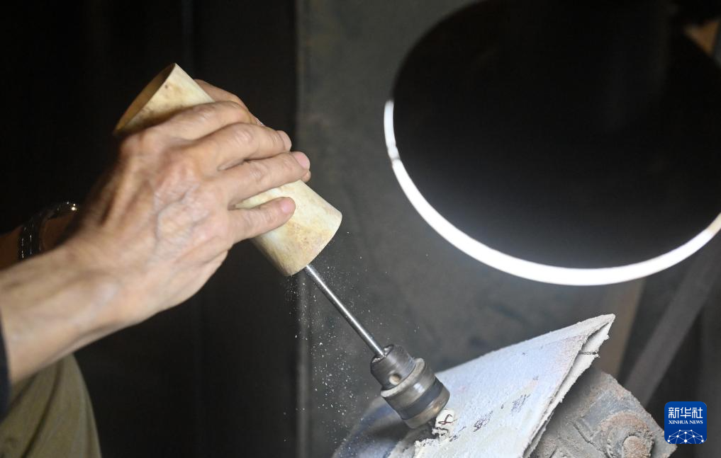 10月10日,黃一格在家中打磨一把馬骨胡的琴筒。