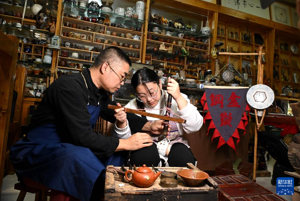 10月11日,在位于河北省石家莊市橋西區的工作室內,李軍航(左)指導女兒李雨童使用金剛鉆為殘破瓷器打孔。