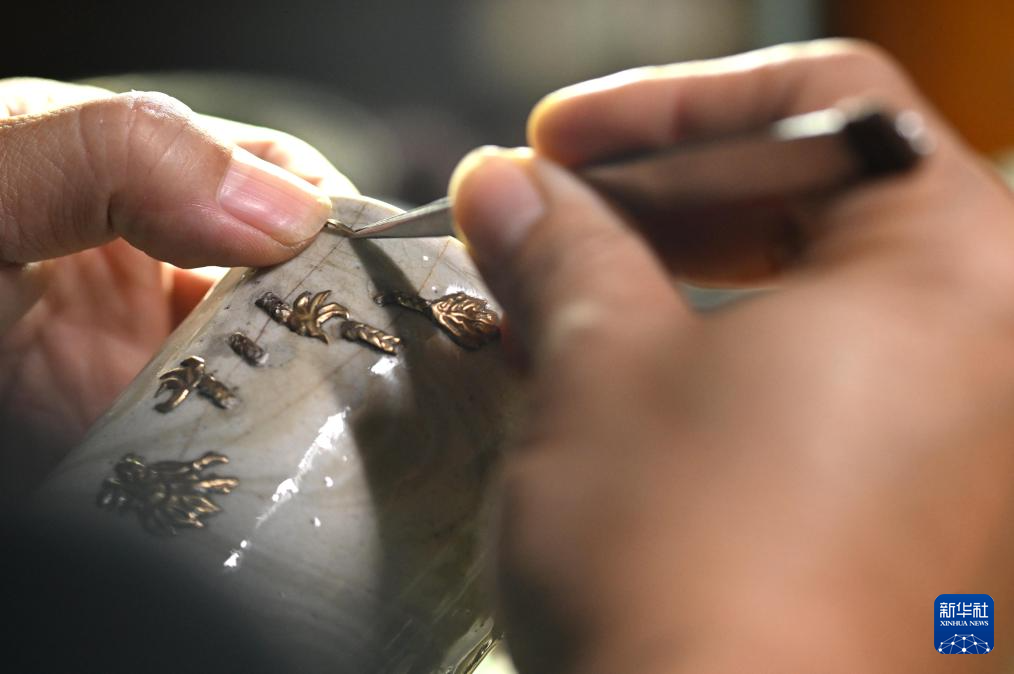 10月11日,在位于河北省石家莊市橋西區的工作室內,李軍航為殘破瓷器嵌釘。