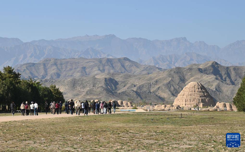 與會專家學者在寧夏銀川西夏陵遺址進行學術考察(10月13日攝)。