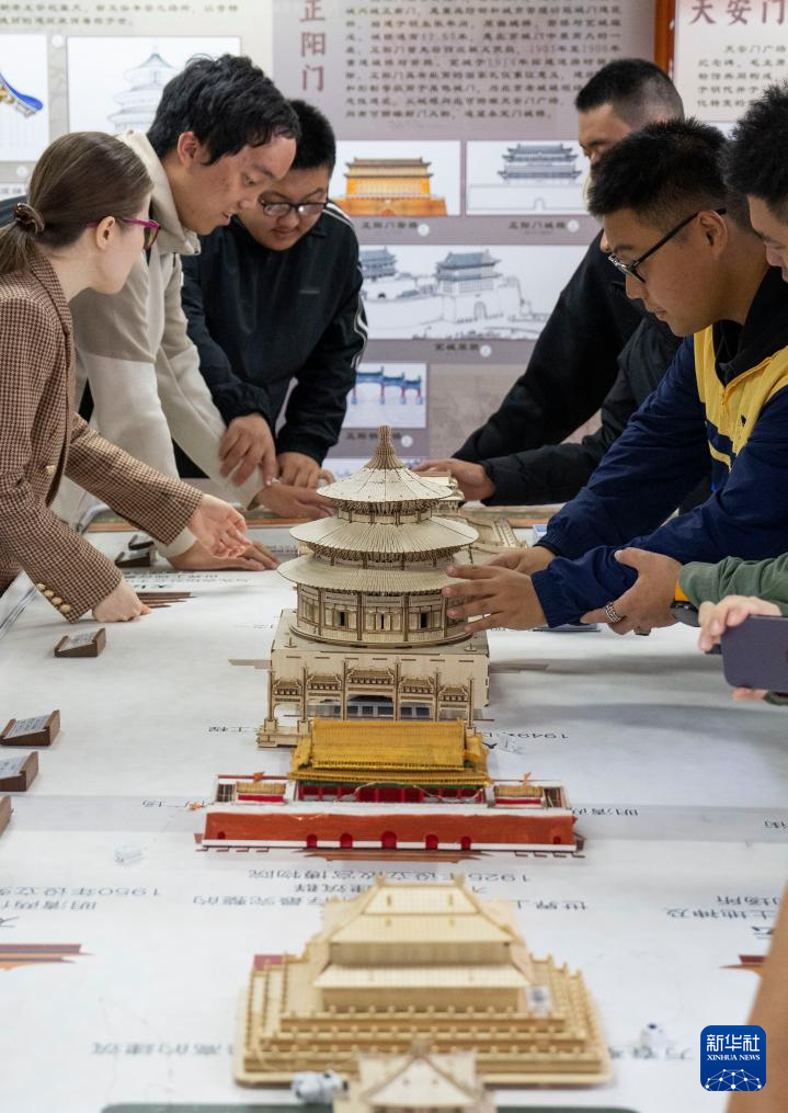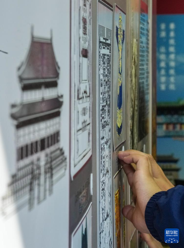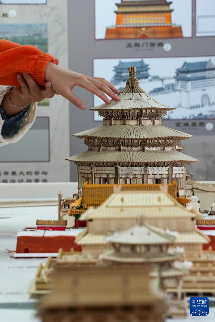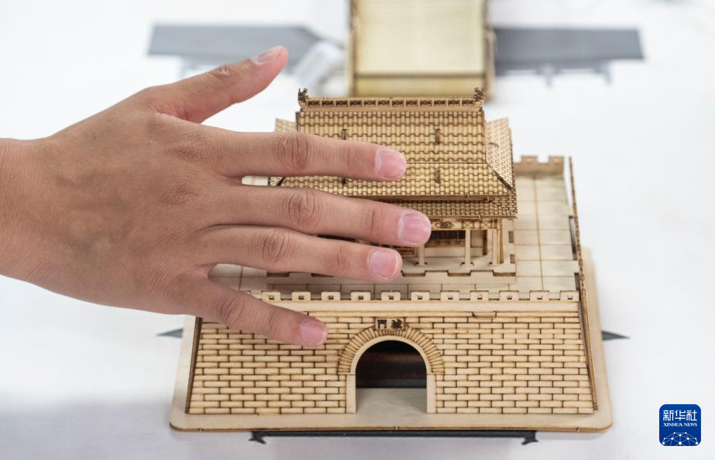 10月13日,視障人士在工作人員幫助下,觸摸北京中軸線建筑模型。