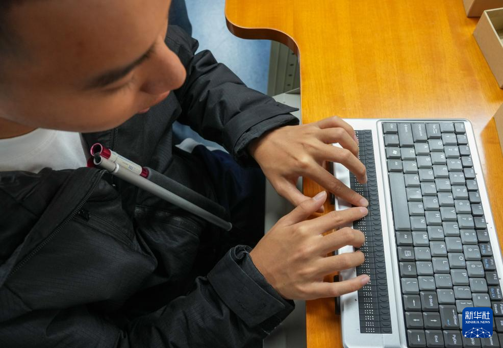 10月13日,視障人士在發布會后,體驗有點顯器的盲文筆記本電腦。