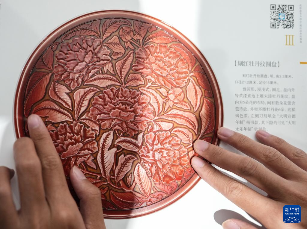 10月13日,視障人士在發布會后,欣賞無障礙版《觸摸故宮珍寶》中的剔紅牡丹紋圓盤。