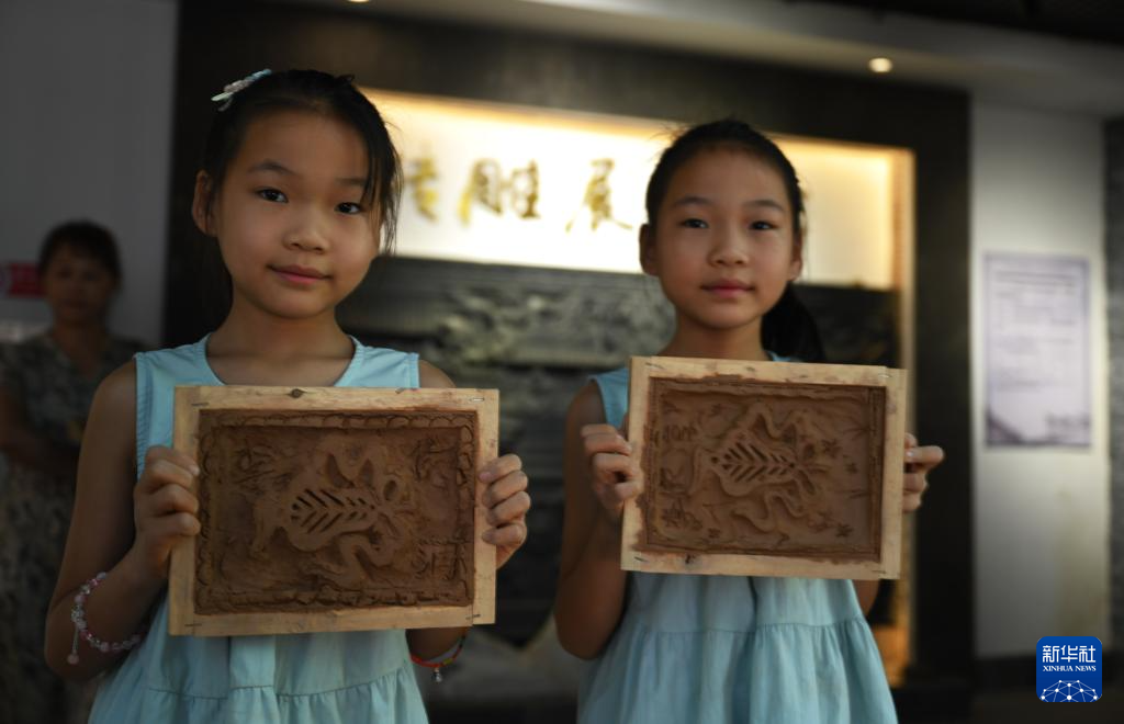 10月12日,參加研學活動的小朋友在寺平村磚雕展示館內展示自己制作的磚雕作品。