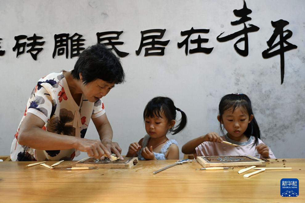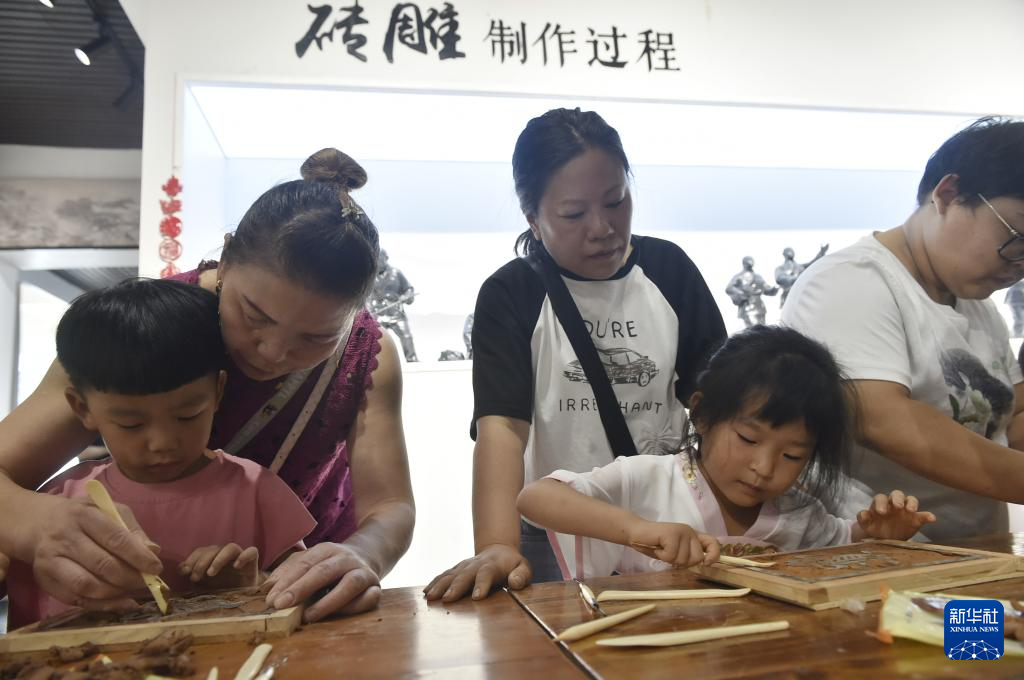 10月12日,參加研學活動的小朋友在寺平村磚雕展示館內體驗制作磚雕。