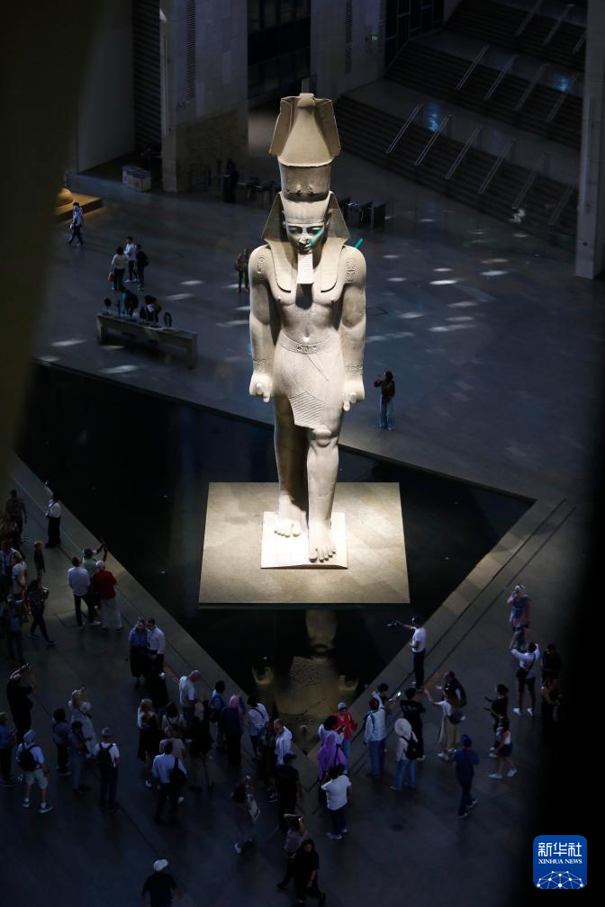 10月14日,在位于埃及吉薩省的大埃及博物館,游客在古埃及法老拉美西斯二世的巨像旁參觀。
